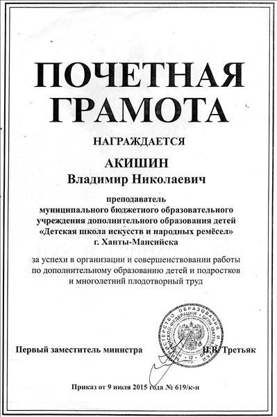 ПОЧЕТНАЯ ГРАМОТА МИНИСТЕРСТВО ОБРАЗОВАНИЯ И НАУКИ РОССИЙСКОЙ ФЕДЕРАЦИИ 2015год