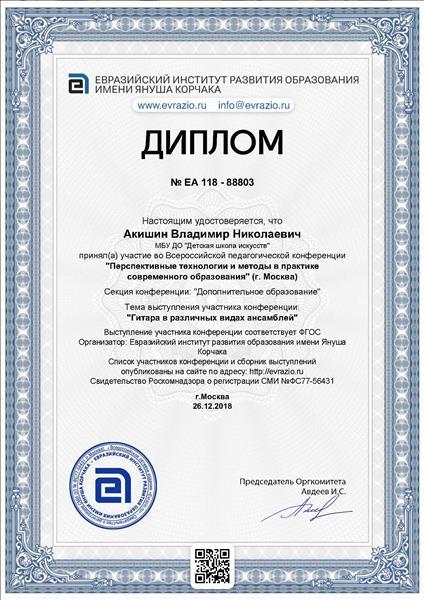 Диплом.Участие во Всеросийской педагогической конференции:"Перспективные технологии и методы в практике современного образования" Еврвзийский институт развитияобразования им. Януша Корчака 2018год